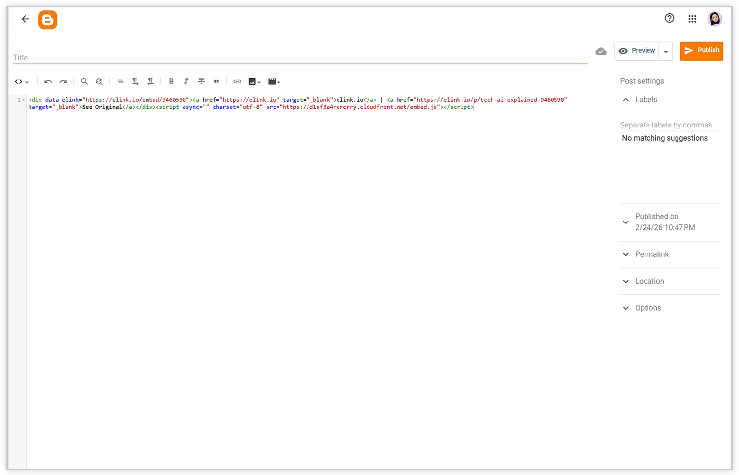 Blogger allows you to embed content using simple embed codes, and that’s where no-code tools come in handy. Platforms like Elink.io do all the heavy lifting for you. You simply curate your content, customize how it looks, and copy-paste the embed code into your Blogger site.