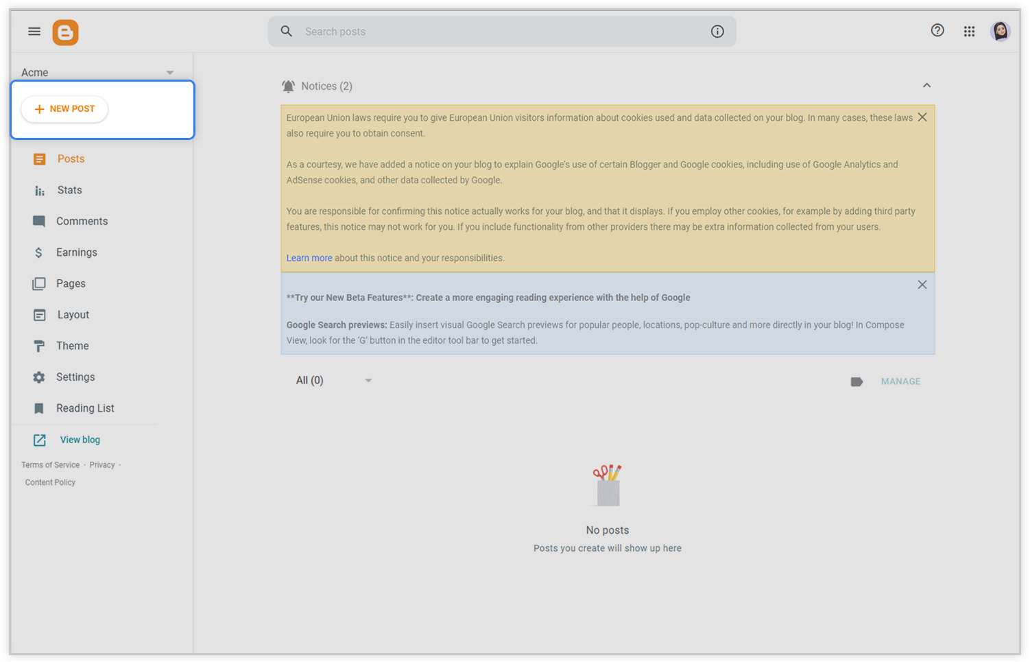 - Now, log in to Blogger.com with your Gmail or any other email id (we assume that you already have a blog website created on Blogger) and click the New Post button on your dashboard.